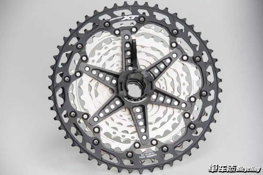 M8100飞轮的2X系统分别设有10-45T、1X系统则设有10-51T,以1X系统为例,最小五个飞轮片以2齿跳进(10-18T),21到33齿则每个以3、4、5齿而进,最后的45T到51T则直接以6齿跳进。