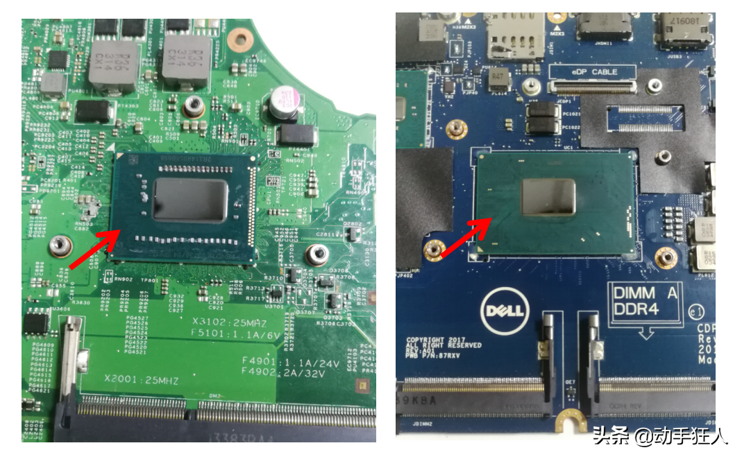 上图3所示为板载CPU,这类板载cpu,极大的节省了笔记本电脑内部空间,从而让笔记本电脑可以做得更加轻薄,更加美观,仔细回想,大家也许能发现14年以后市面上出现了更多的轻薄款笔记本电脑,基本都是板载cpu的,但是板载cpu的电脑也有个缺点,就是无法单独对cpu进行升级,因为cpu是跟主板集成在一起的,不可单独拆卸CPU,如果非要升级CPU,只能连同整个主板一起更换成搭载有更高级CPU的同款机型的主板,这样无疑大大的增加了升级代价,这里要说一下,从14年开始,14年以后的笔记本电脑都是板载CPU,CPU都是不可单独拆卸的(极少数搭载台式机cpu的笔记本电脑除外),为什么会这样,我想是厂家们的意思,说实话有点坑,这样以后大家的主板如果出问题了,更换主板的话,大大的增加了维修代价。