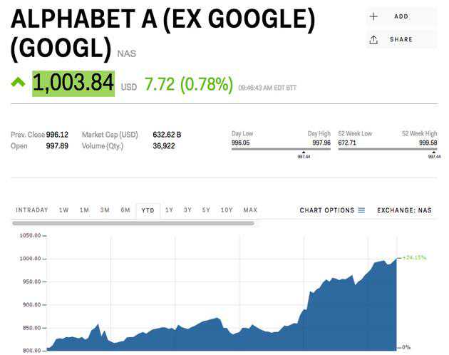 中关村在线消息:北京时间6月5日晚间,谷歌母公司Alphabet股价于周一早盘交易中首次突破1000美元大关。2014年8月谷歌在纳斯达克进行了IPO(首次公开招股),这也是近13年来谷歌股价首次突破1000美元。