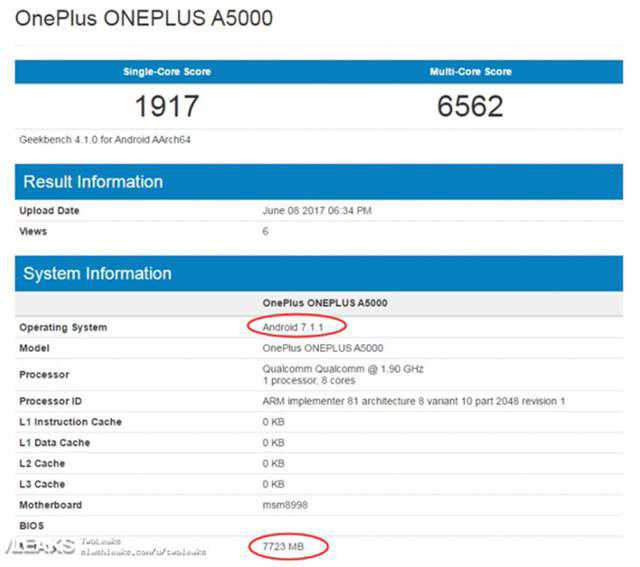 今天,一加5现身GeekBench跑分网站,页面显示,一加5配备8GB内存,预装系统,型号为A5000。单核跑分1917,多核跑分6562。根据这次曝出的信息,一加5将是全球第三款配备8GBRAM的手机,前两位则是华硕ZenFoneAR和努比亚Z17。