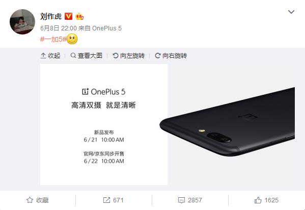 一加手机5发布时间公布:6月21日10点(图片引自微博)