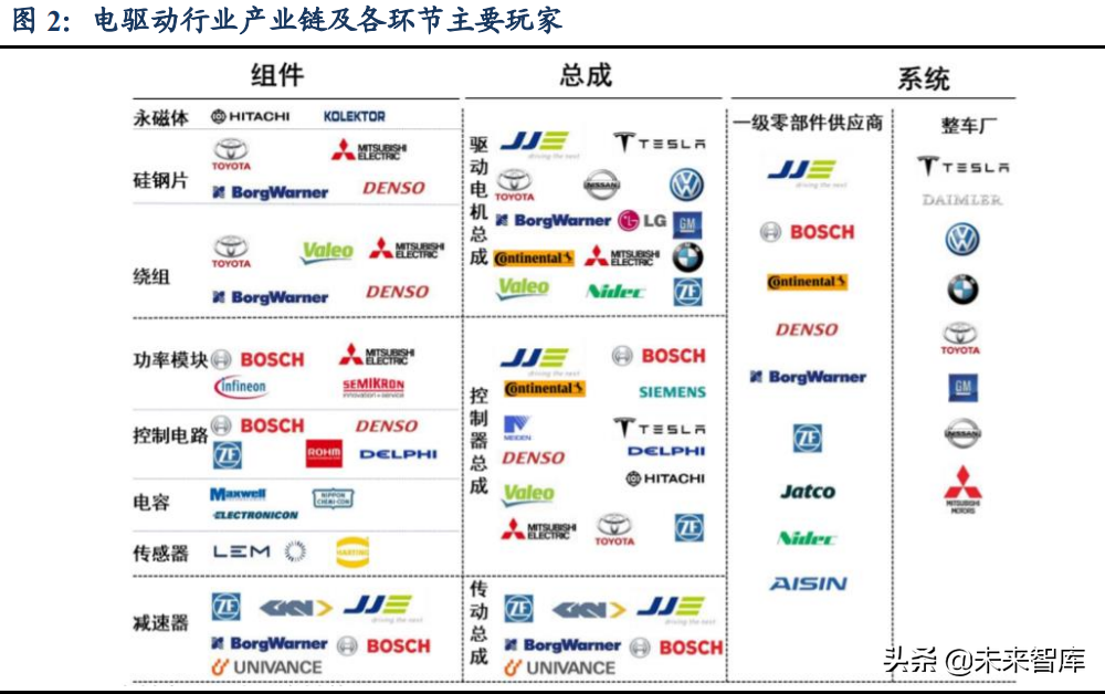 电驱动产业链涉及环节较多,可以概括为零件—总成—系统—整车厂四大层级。上游零部件包括永磁体、硅钢体、功率模块、电容、传感器等,这一级的玩家对在整车产业链中属于“三级供应商”。在零部件基础上进一步设计组装得到电机总成、电控总成与传动总成,这一级的玩家可以称为车企的“二级供应商”;各个单独总成进一步集成为电驱动系统供货于车企,这一级玩家为行业“一级供应商”。