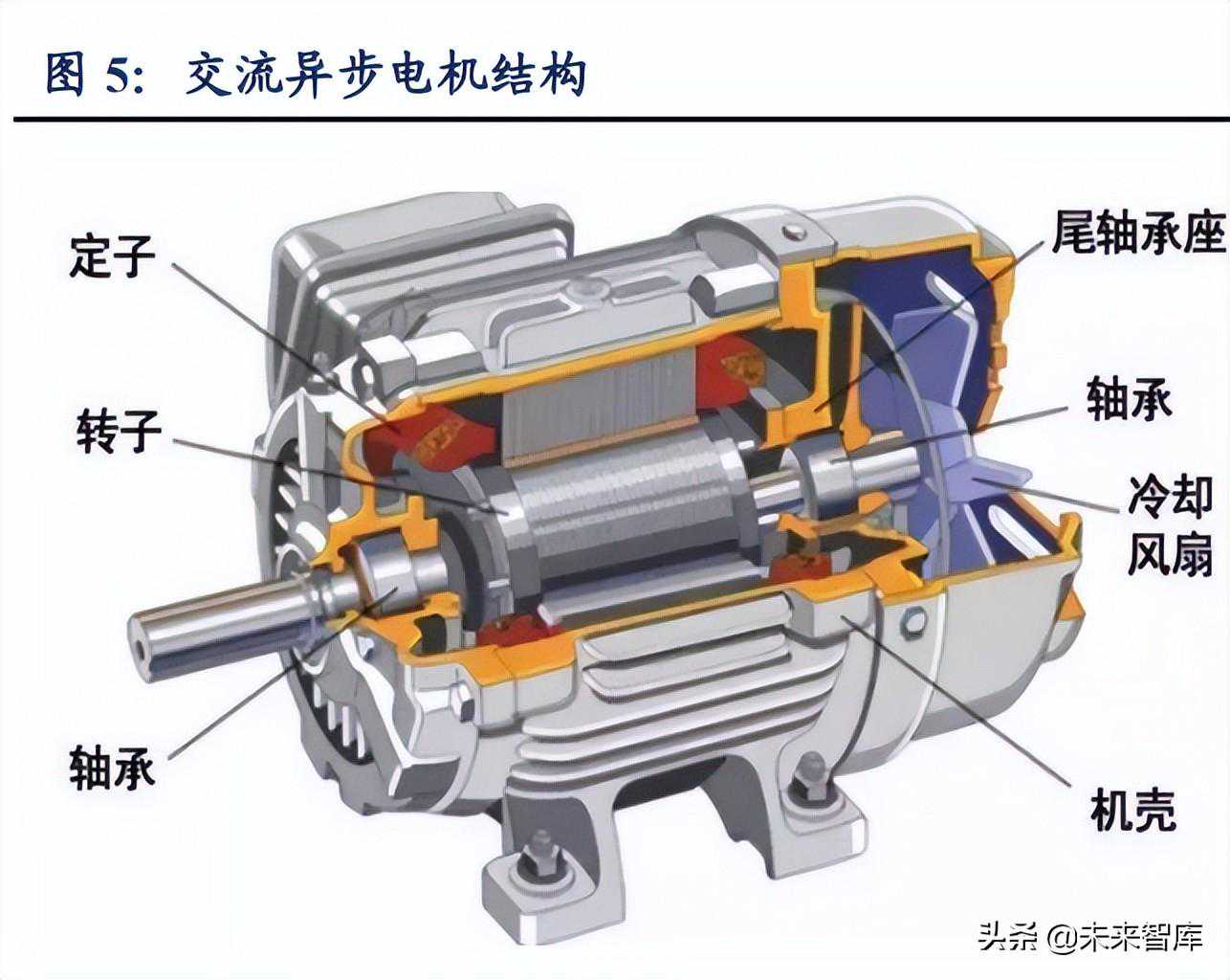 电驱动系统在新能源汽车成本中占比仅次于电池。电驱动系统(电机、电控、减速器)是新能源汽车动力总成的关键部件,相当于传统燃油车发动机的作用,直接决定整车的动力性能。其成本占比仅次电池,占比绝对值因新能源汽车品牌、车型而异。驱动电机主要技术路径聚焦在永磁同步电机交流异步电机上。永磁同步电机与交流异步电机的主要区别点在于转子结构,永磁同步电机会在转子上放置永磁体,由磁体产生磁场;而交流异步电机则是由定子绕组通电产生旋转磁场。功率密度、效率(高效率区间)是衡量电机性能的关键指标:1)功率密度越大代表着相同功率下的电机体积更小,有利于节省空间制造成本;2)效率越高,说明电机端损耗越小,相同电池容量下,新能源车续航里程更长。