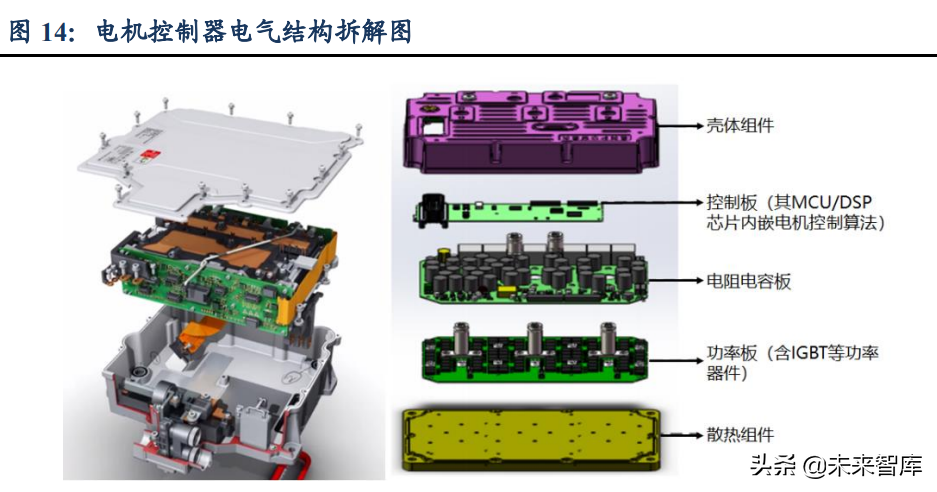 电控系统通过电机控制算法发出信号驱动电机转动,进而控制整个车辆的动力输出。电控系统可分为主控制器和辅助控制器:1)主控制器控制汽车的驱动电机;2)辅助控制器控制汽车的转向电机、制动器、空调等。我们本文重点讨论的电控系统主要指主控制器,主要由控制板(接受整车控制器的信号指令,运行电机控制算法,发出控制指令给功率板)、功率板(接受控制板指令,频繁通断IGBT/MOSFET,控制电机转动)、壳体等组成,在控制器中,控制电路板、功率电路板成本主要在于IGBT(绝缘栅双极型晶体管)、MOSFET(功率场效应晶体管)、MCU(微控制器)、电源芯片等半导体器件。