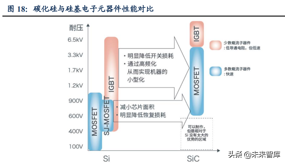 碳化硅功率器件可显著提高电控效率、功率密度等性能。碳化硅材料具有禁带宽度大、热导率高、电子饱和迁移速率高等性质,相比硅基IGBT,碳化硅元器件体积更小、频率更高、开关损耗更小,可以使电驱动系统在高压、高温下保持高速稳定运行(硅基IGBT只能在200℃以下的环境中工作)。根据意法半导体,在400V电压平台下,相较于硅基IGBT,碳化硅功率件有2-4%的效率提升;在750V电压平台下,碳化硅器件有3.5-8%的效率提升。