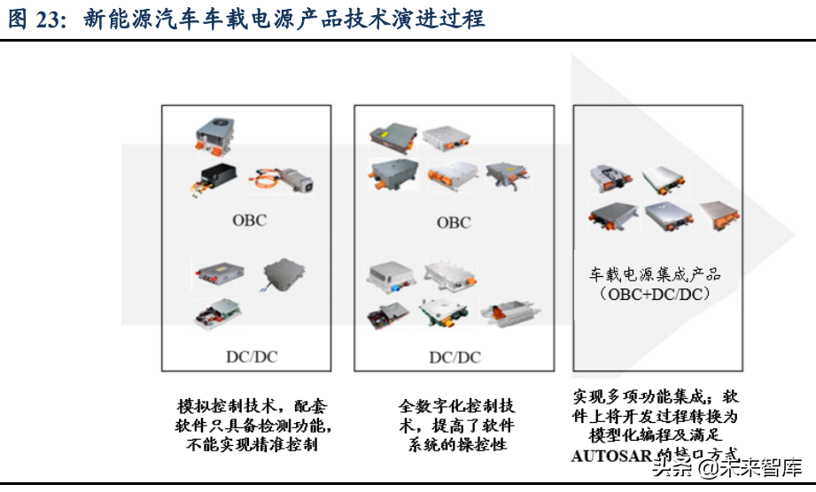 技术持续演进,集成化趋势同样显著,软硬件能力都将迎来考验。早期车载电源产品主要采用模拟控制技术,产品功能较为单一,配套的软件只具备检测功能,不能实现精准控制。之后车载电源产品向数字化技术转变,能够实现复杂的控制算法,实现输出参数的灵活调整和精准控制,提高了软件系统的操控性,包括车载电源的诊断、升级和参数调整等应用需求。下一代车载电源产品将向集成化转变,在硬件、软件、体积、重量四个维度实现创新突破。硬件上有望将进一步采用更高性能的碳化硅器件;软件上将开发过程转换为模型化编程及满足AUTOSAR的接口方式,提升软件稳定性和灵活性;在体积和重量上实现小型化、轻量化。