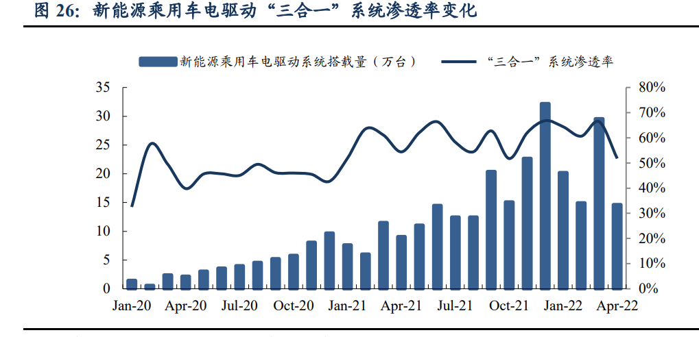 现有集成产品以“三合一”为主,集成度更高的“多合一”新产品也在不断问世。根据NE时代新能源,2022年1-4月新能源乘用车搭载的电驱动系统中,分体式、电机/电控“二合一”合计占比为44%,“三合一”占比为52%,“多合一”占比为4%。同时,OBC、DC-DC、PDU等充配电系统集成产品应用也不断增加,结合电驱系统集成产品将形成集成度更高的多合一平台。