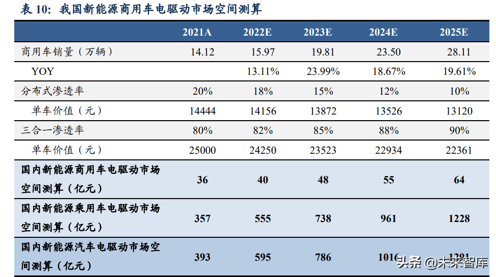 3)集成化占比提高:我们将电驱动电源市场分为分布式、二合一、三合一(含少量“多合一”),我们假设“三合一”渗透率不断提升、2025年达到59%(基本覆盖A级及以上的车型)。