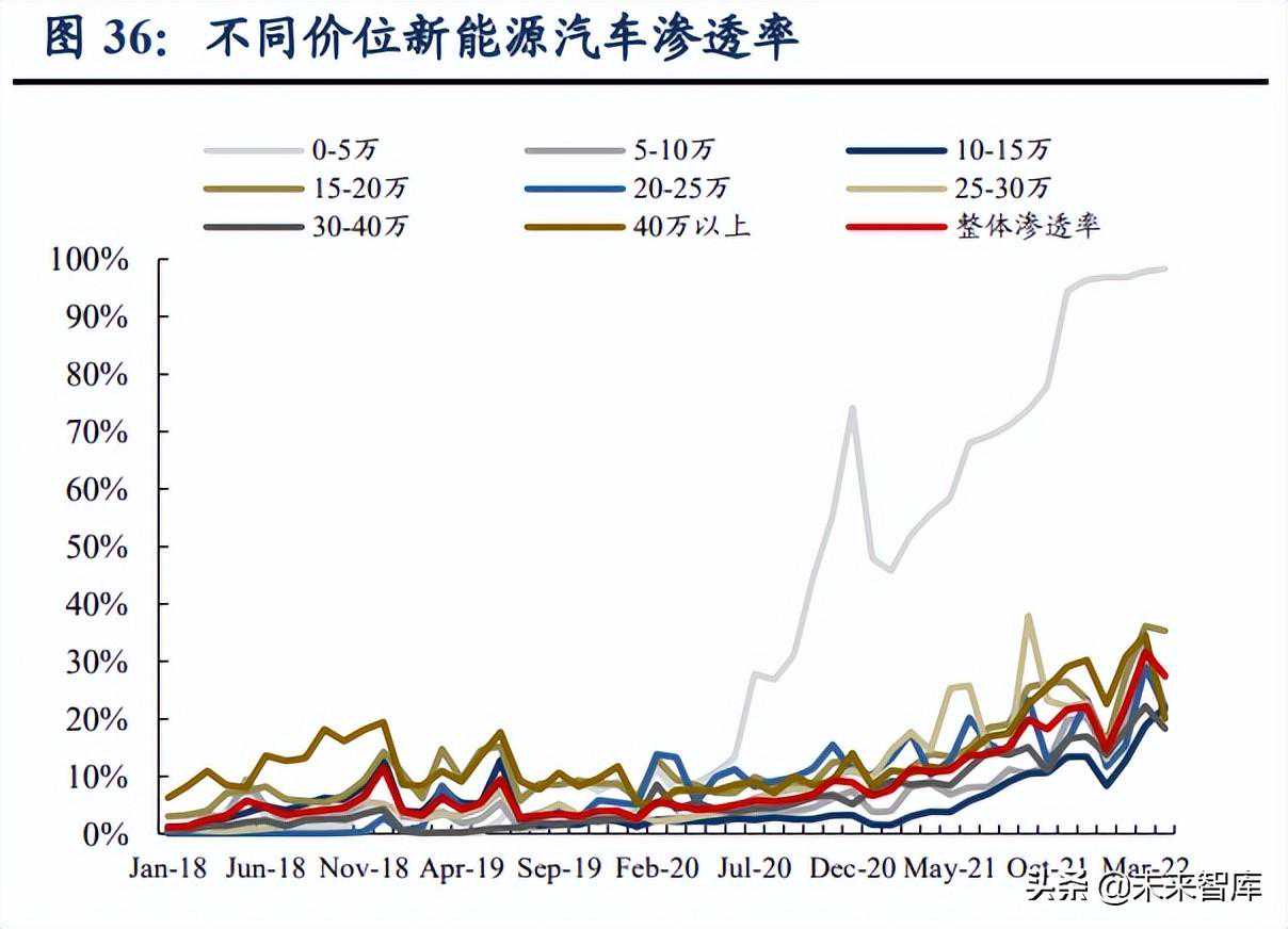 分市场来看:1)从汽车级别来看,根据建约车评,2020年纯电动车销量中A00/A0/A/B/C级车分别占比为32%/10%/33%/23%/1%,2022年1-4月占比分别为32%/16%/23%/28%/1%,其中B级车占比提升明显(相比2020年+5pct)。依照前文分类,2022年1-4月以车级别定义的中低端/中高端中端市场占比48%/29%/23%;2)从车辆价格来看,目前10-15万元价格区间的新能源车销量仍为主导,2022年4月销量占比达25%。同时,15-20万元的车型销量占比不断提升,2022年4月达21%,依照前文分类,以价格区间定义的中低端/中高端中端市场占比55%/24%/21%,与按汽车级别定义的市场结构相近。