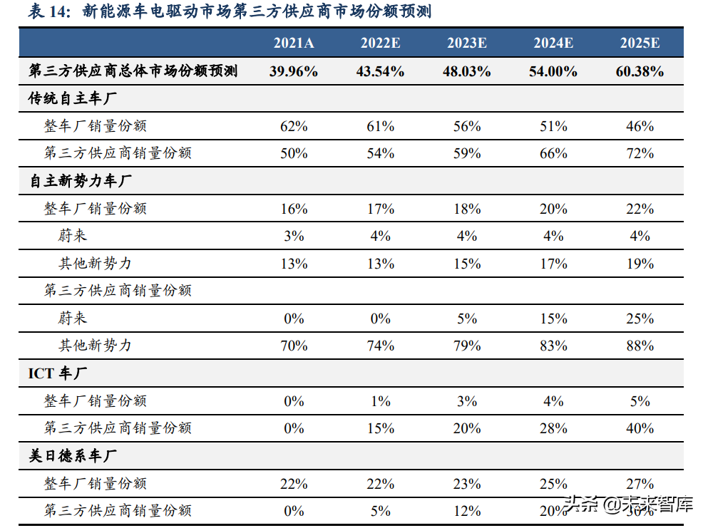 经我们测算,2021年/2025年第三方供应商总体销量份额为40%/60%。整车厂前期因新能车出货量相对不大,部分车企选择自制电驱动/电源系统,但后期随新能源车年销量过百万辆、车型品类丰富等,对自制体系的成本控制能力、快速研发能力、产能等都提出较大挑战。届时,我们预计第三方凭借技术平台完备,以标准化促定制化开发,叠加定点车型销量较大,规模效应强劲,在成本、开发速度、产能方面均具备更强竞争优势。不同于燃油车,电池、电驱作为新能源汽车中最重要的板块,如果全部外包给第三方供应商,那么留给车企的参与环节将大幅减少,这将不断降低产业壁垒,缩小盈利空间,因此从整车厂的经营战略来考虑,部分车企未来仍会坚持“部分自供”。综上,我们预计多数整车厂在性能要求苛刻的中高端平台(B级及以上)部分采用自供体系、部分外供,中端、中低端市场的车型开放供应链给第三方。结合上一节不同品牌车的销量占比数据,我们测算2021年第三方供应商总体销量份额约39.96%,至2025年份额有望提升至60.38%。