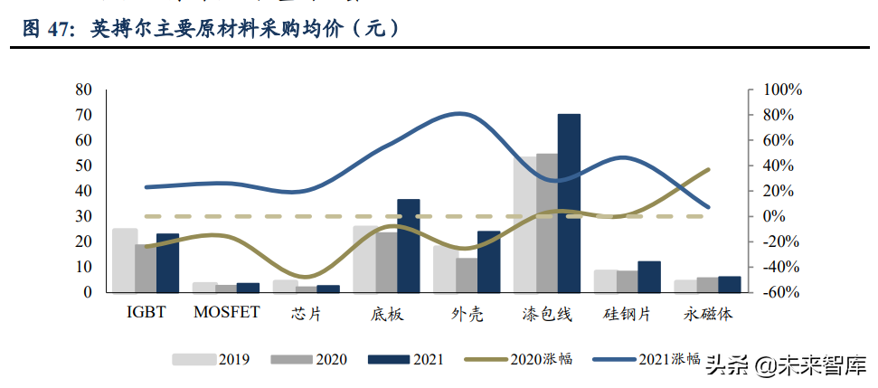 成本的优化主要来自于:1)技术方案的优化;2)规模效应。在技术方案优化中,核心零部件的国产化将是降本的重要推力;而规模效应则主要依赖于既有市场份额的多少及未来产能的布局。成本结构方面,电子器件、大宗原材料成本占比较高。根据英搏尔非公开发行股票募集说明书,2021年其原材料采购金额中占比最高的三类为电子器件(MOSFET、IGBT、各类芯片等)、结构件(底板、外壳、五金件等)、电机类材料(硅钢、永磁体、漆包线等),分别占当期采购金额的49%、18%、16%。