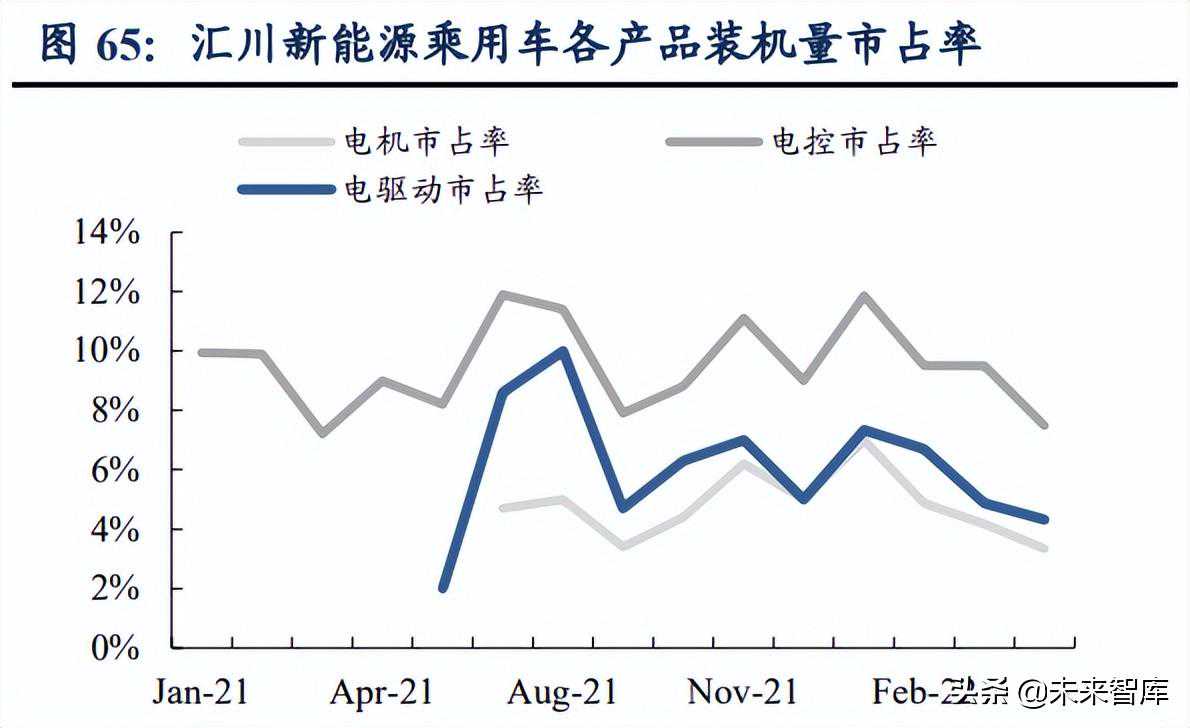 优势三:混动车“先发制人”,销量市占率持续领先。汇川较早即布局了混动技术路线,2019年产品即进入B样状态。根据公司年报,2021年第二代乘用车混动汽车电控已实现量产,可以满足国际一流整车厂的混动车型需求;第一代乘用车混动汽车电机、第三代乘用车混动汽车电控处于设计验证阶段。在新项目定点上,混动同样成为2021年一大亮点。过去汇川定点项目主要以纯电车型主,2021年混动车型新增定点项目占总新增的30%以上,公司在混动领域销量份额进一步得到提升。2021年6月,公司与奇瑞签订战略合作协议,双方有望在乘用车高压纯电方案和混动方案上进一步加深合作。