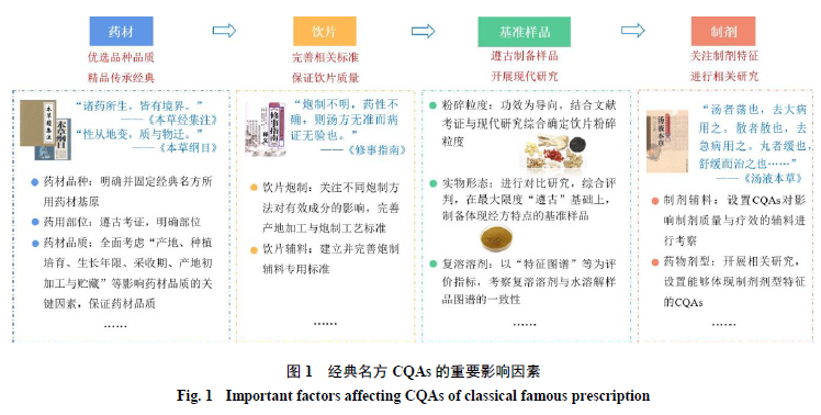 1经典名方的CQAsCQAs一般在药品研发阶段,通过综合考虑影响产品质量的各种因素来研究确定[2]。药材品种、药用部位、药材品质(产地、种植培育、生长年限、采收期、产地初加工、贮藏)、中药炮制、制剂生产及临床使用等是影响中药制剂质量的重要因素。因此,经典名方的CQAs研究应充分考虑以上重要因素,在经方研发的全过程辨识符合中医药特点的“物理、化学、生物或微生物”层面的CQAs。