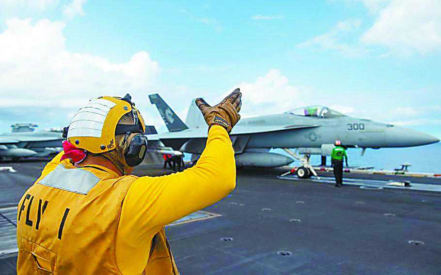 一架“超级大黄蜂”战机6日准备在“卡尔·文森”号航母上起飞。