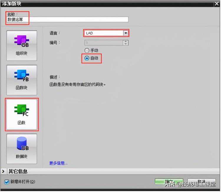 在项目树中找到“PLC_1”文件夹,双击“添加新块”,然后选择FC块,就可以新增一个FC块了,我们可以对这个块进行命名,选择块中程序的设计语言,以及分配这个块的编号,当然这个块编号可以系统自动分配,也可以我们自己手动分配。