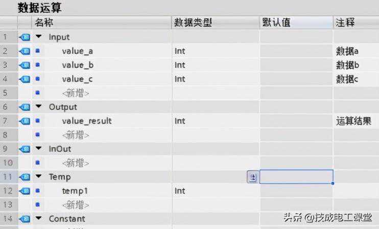 我们在程序接口区定义变量。在FC的接口参数中主要有五种变量,分别是INPUT、OUTPUT、INOUT、TEMP和常量Constant。