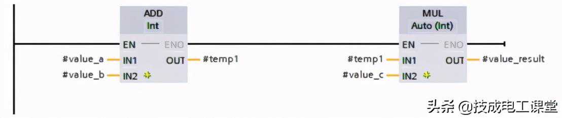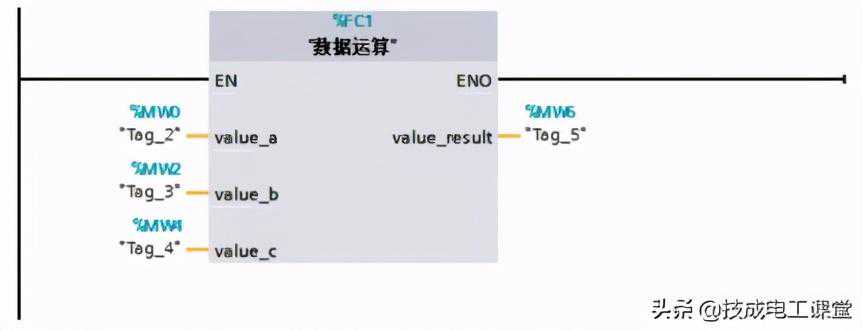 如下图,我们建立好变量并编写FC内部的程序,最后在OB1中调用这个数据运算的FC块,我们可以看到在调用时是有分配实参的,是吧?