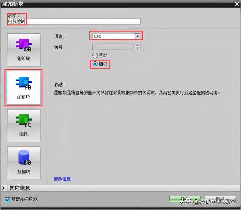 在项目树中找到“PLC_1”文件夹,双击“添加新块”,然后选择FB块,就可以新增一个FB块了,我们可以对这个块进行命名,选择块中程序的设计语言,以及分配这个块的编号,当然这个块编号可以系统自动分配,也可以我们自己手动分配。