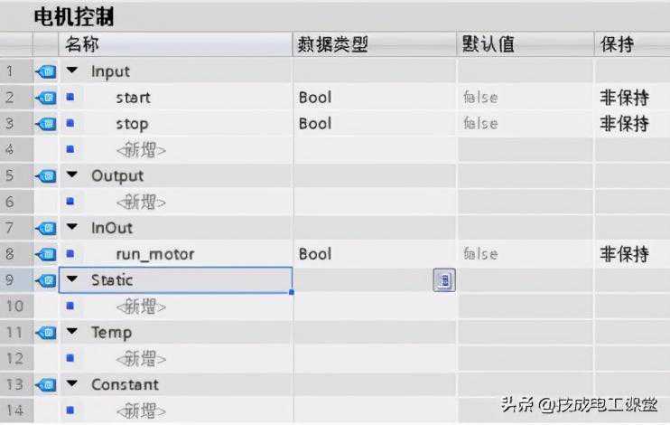 我们要建立带形式参数的FB块,同样的需要建立相应的变量,在FB的接口参数中主要有六种变量,分别是INPUT、OUTPUT、INOUT、TEMP、Constant和Static变量,我们可以看到这相对比于FC块多增了一个静态变量Static。