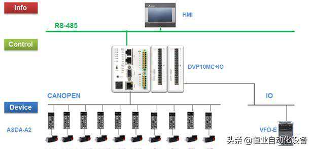 该系统控制解决方案的控制核心采用台达总线型运动控制器DVP-10MC。该控制器包含PLC模块和MC运动控制模块来两大功能模块。PLC模块可编写台达标准的逻辑程序,MC运动控制模块则可通过CANopen总线对伺服驱动器进行精密控制,以完成用户所期望的速度控制、位置控制等功能。方案主要特色: