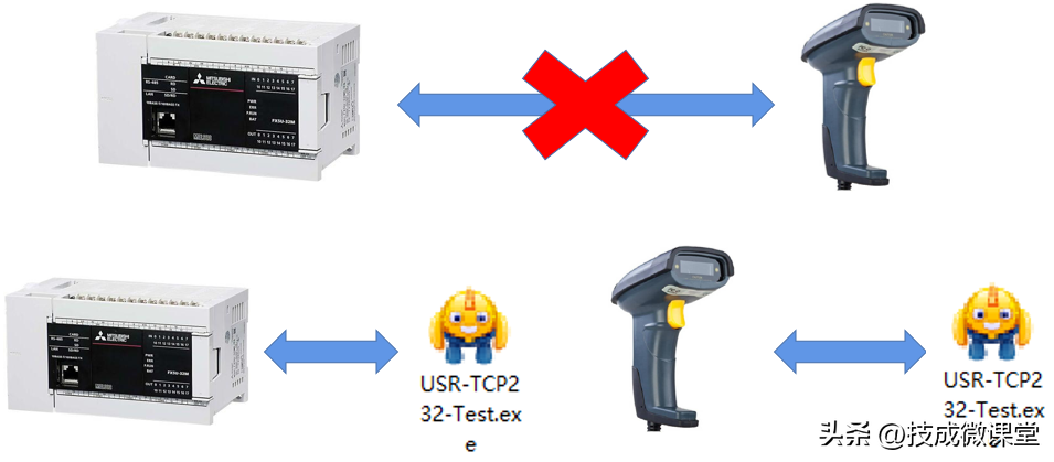 以扫码枪为例,当FX5U跟扫码枪通讯不上时,可以利用FX5U发送数据给串口调试助手,串口调试助手发送数据给扫码枪,当两个设备都正常时,对比一下数据即可以解决问题。如图1-1所示。
