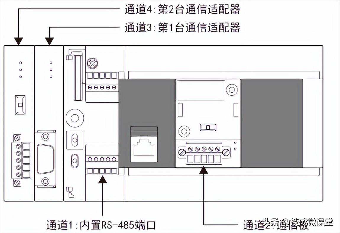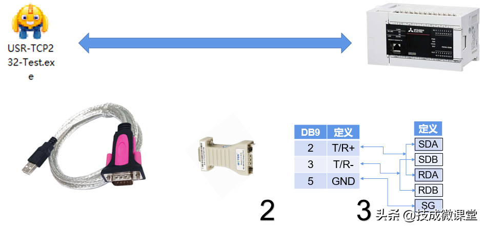 1硬件接线图在购买扫码枪时,记得选择配对的型号。本案例中选用的扫码枪本体是网口并且附赠了一条RJ45转RS232的通讯线。由于通讯接口都是母头,所以需要用两个公头短接起来,并且把接收和发送的线接好,如图3-1中的1所示。由于FX5U的PLC本体是485接口,所以需要选用一个RS232转RS485的模块,如图3-2中的2所示。