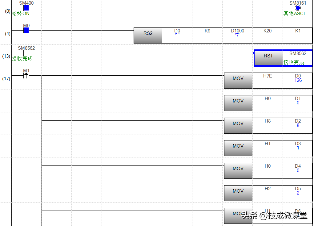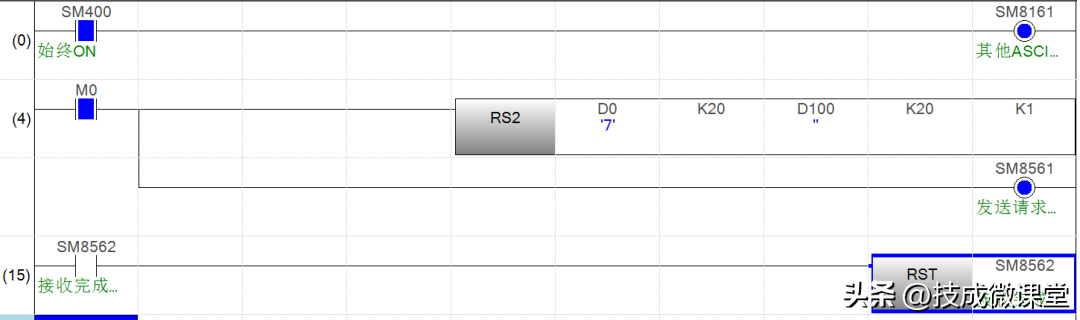 6找出问题并纠正错误利用FX5U发送给串口调试助手的程序发送给扫码枪,已经可以得到正确的数据,修改后的程序: