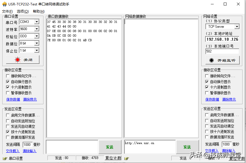 我们此时可以利用串口调试助手去判断软件问题。把PLC发送的数据传给串口调试助手;串口调试助手把数据发送给对应设备;分为两个部分。通过这两个部分的数据对比就可以清楚软件是否有问题了。