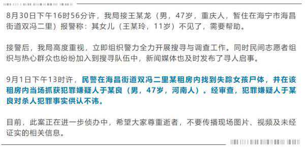 海宁公安发布“警情通报”小女孩不幸被害凶手已抓获并对杀人犯罪事实供认不讳