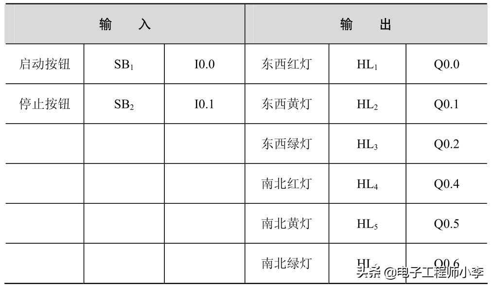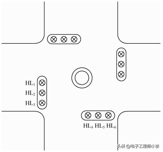 某交通路口红、黄、绿灯位置如图7.53所示,其基本控制要求如下:路口南北方向绿灯显示亮10s后(同时东西方向亮红灯),黄灯以亮1s灭1s的周期闪烁3次(同时东西方向亮红灯),然后变为红灯(同时东西方向绿灯亮、黄灯闪烁),如此循环工作。