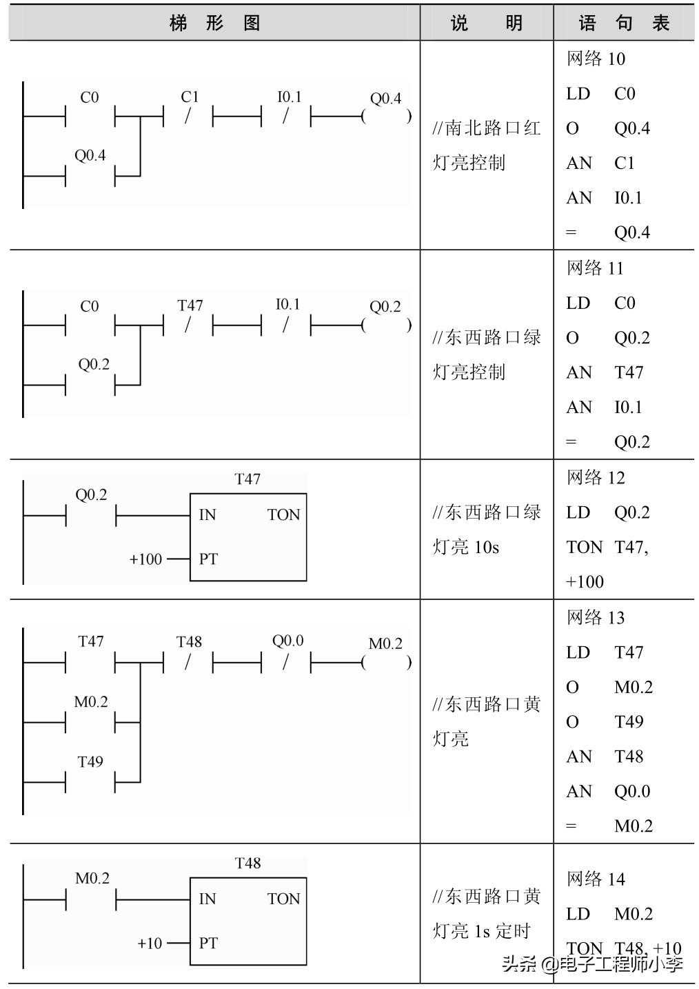 表7.21交通路口红、黄、绿灯PLC控制梯形图及语句表