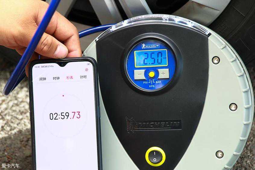 官方数据充胎时间为3分钟,实际从0.8BAR到2.5BAR使用了2分59秒,与实测有些误差。固特异和米其林两款充气泵充胎时间实测结果相差不大。