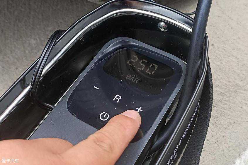 然后在充气泵上通过加压和减压按钮将胎压调整为2.5BAR。