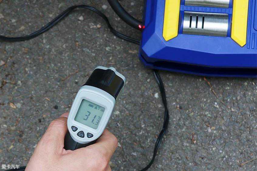 在给轮胎充完气后,我们用激光测温仪对固特异充气泵进行了温度测试,在选取多个点的温度后,其中最高的温度为31.3℃,并不影响继续使用。
