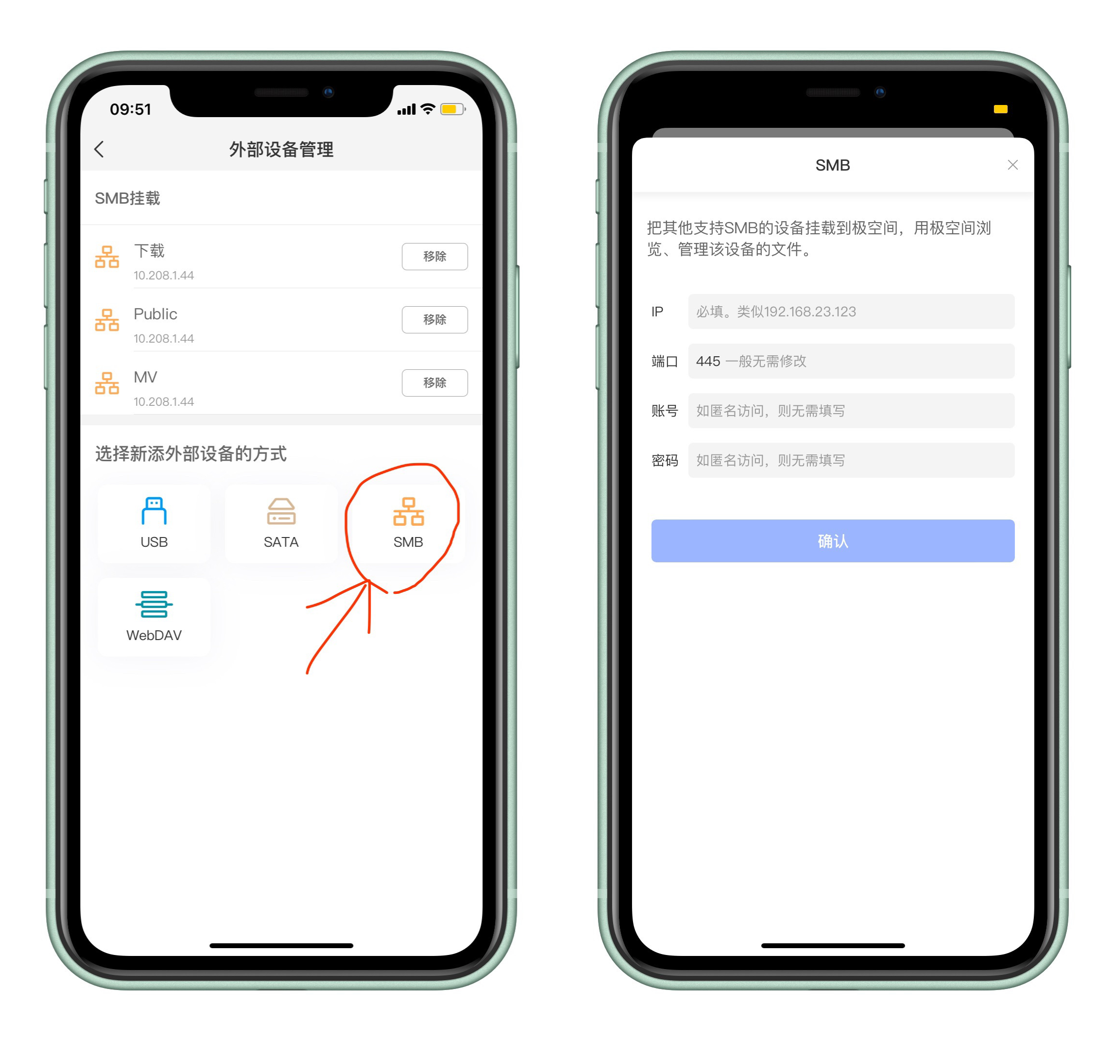 录入后就可以选择我们自己NAS里的文件夹了,最后就会显示在外部设备这里