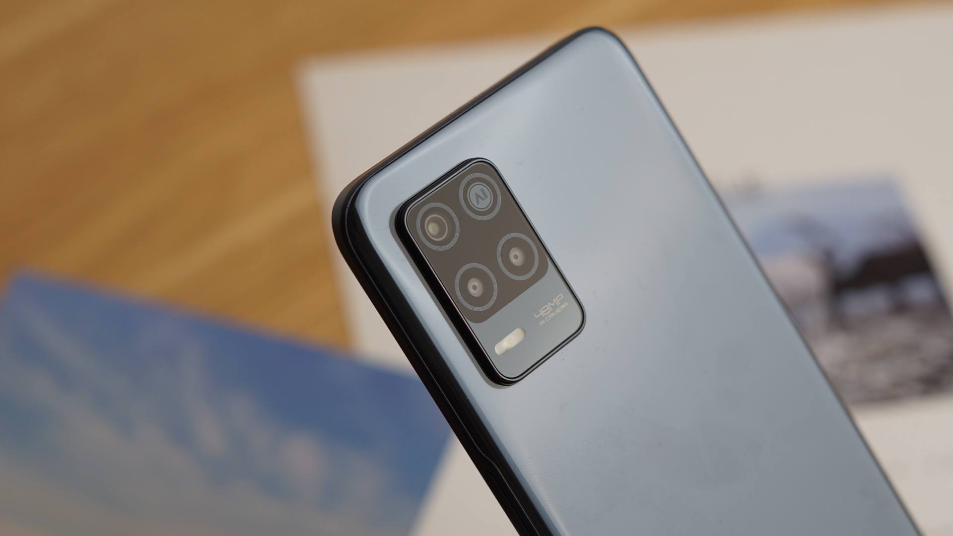 机身背面,realme真我V13背面似乎就使用了家族化的设计语言,左上角为三颗摄像头,与传感器形成“四桶”麻将状,下方则是闪光灯,沉稳又不失时尚。