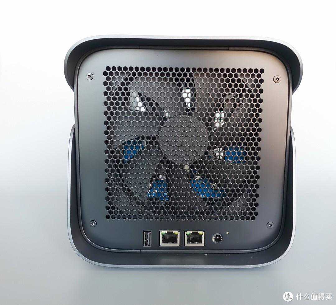 从另一侧角度来看,更像是一个Z形了。讲道理我个人挺喜欢这个炫酷的造型,感觉比起方方正正的传统NAS来说,科技范儿更足。