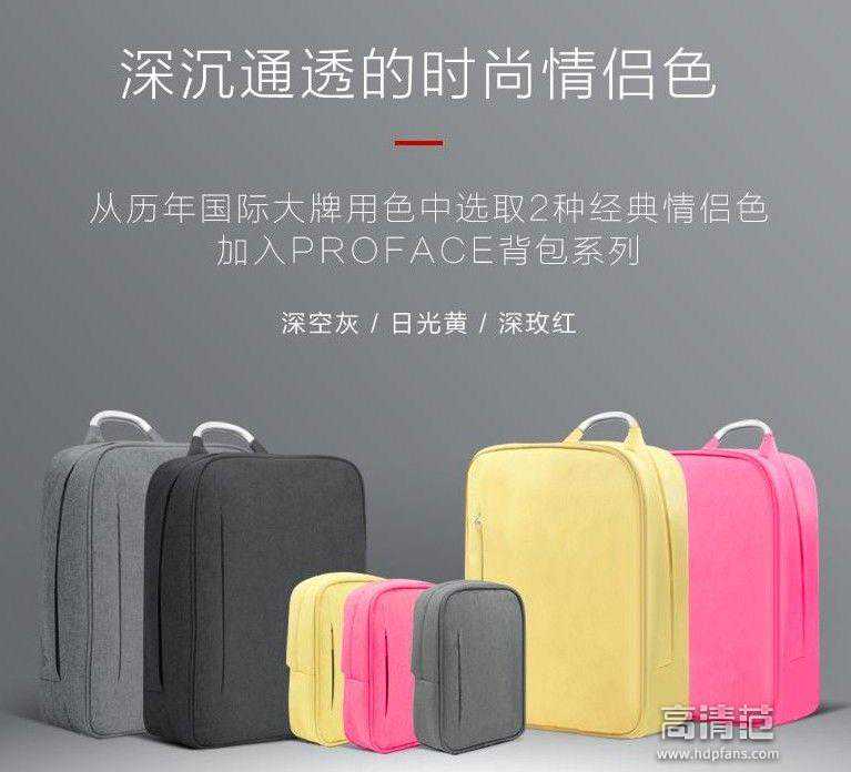 PROFACE双肩包颜色丰富多选,深空灰、日光黄和深玫红都属于经典色系,被大多数人接受喜欢,还可看到PROFACE分为普通版和极简一体(缩小版)两种款式。