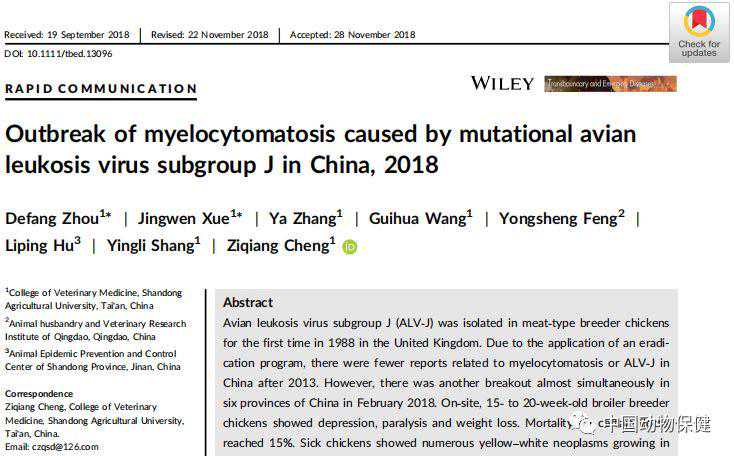 本文作者指出,尽管ALV-J的根除在中国十分成功,但在2018年检测到突变株导致的疫情,并快速传播。对于ALV-J突变毒株生物学特性和致病机理的研究应继续深入开展。