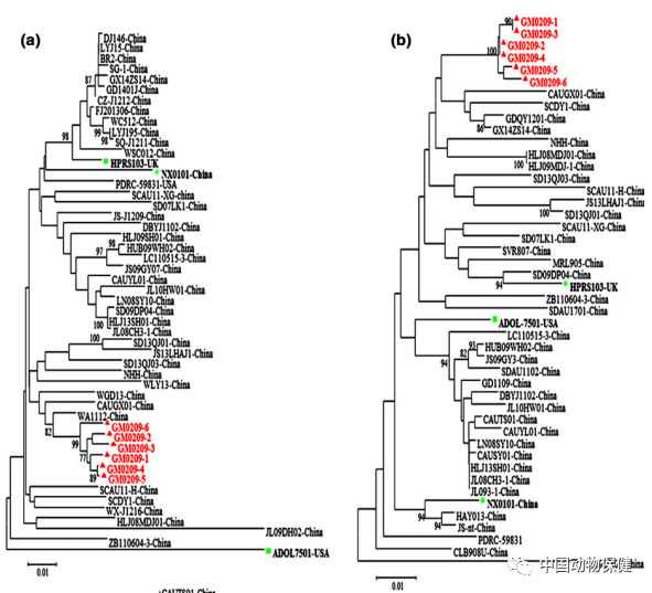 基于GP85和GP37基因的演化分析显示,本次研究中分离到的GM0209毒株群与标准毒株ADOL‐7501,HPRS‐103和NX0101显著不同。GP85蛋白hr1和hr2间保守区域发生R176G突变,该突变在其他44株ALV-J中并未发现。