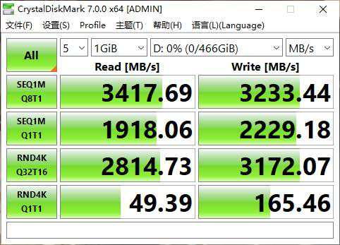 跑CDM,持续读取跑出3417MB/s,持续写入跑出3233MB/s,这跟官方给出的3400、3200MB/s的数据是一致的。在4KQD1的随机读写上,跑出50、165MB/s的成绩,回顾我之前跑的一些来看,这个水平属于一线水准。