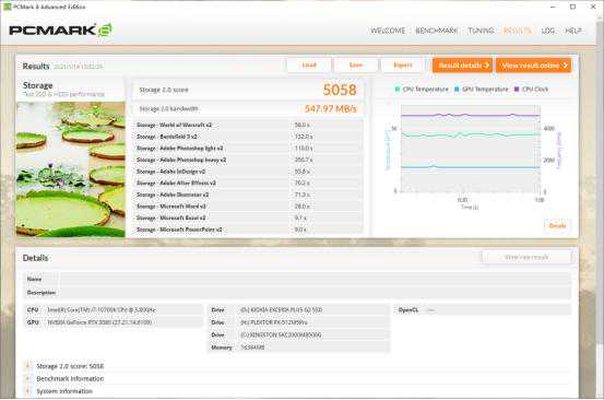 铠侠EXCERIAPLUSG2500G在PCMark8存储测试中取得了5058的成绩,传输带宽达到547.97MB/s,已属于旗舰级NVMe固态硬盘水平。