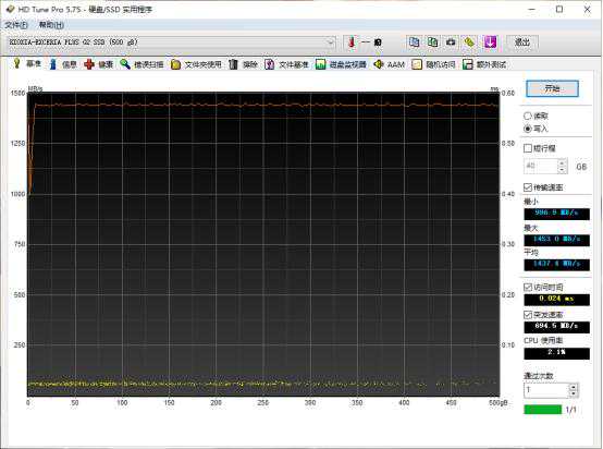 空盘时,铠侠EXCERIAPLUSG2500G在HDTune写入性能,平均保持在1437MB/s。