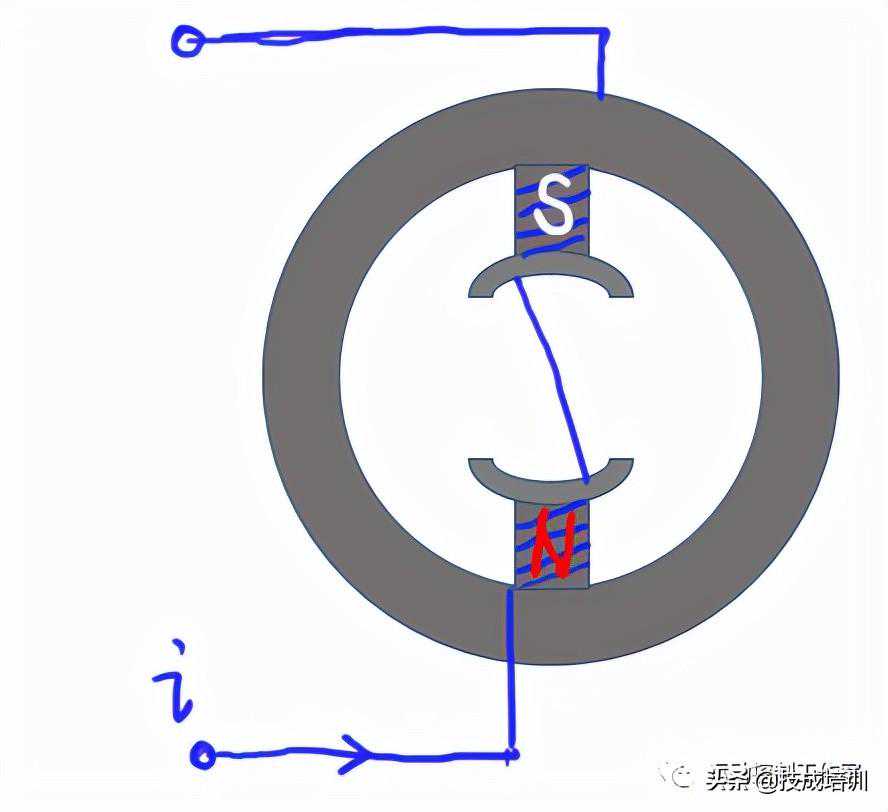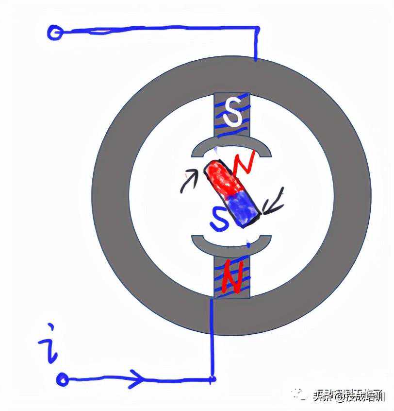 如果在N极和S极之间插入磁铁棒,如下图所示,磁铁棒受定子磁场的吸引,就有顺时针旋转的趋势。电机转矩就是依靠定子和转子之间的磁力产生,如图7所示: