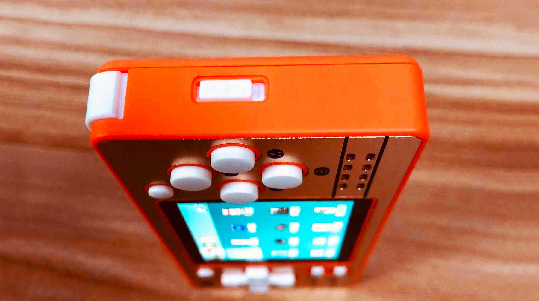 除开按键,Q20mini的正面还有屏幕和扬声器,它们的位置不在一起,但属于一个“系统”。Q20mini的屏幕居中设计,尺寸为2.4英寸,周边有一圈橙色塑料边做保护用,让屏幕不至于受到剐蹭。Q20mini的屏幕使用普通液晶屏,240*320分辨率,精度尚可,但不支持触控,所有操作均需通过导航键进行。在屏幕右侧,是Q20mini的外置扬声器,游戏场景下,发声效果一般,考虑到近距离掌上使用,听声辨位,勉强可以收到不错效果。