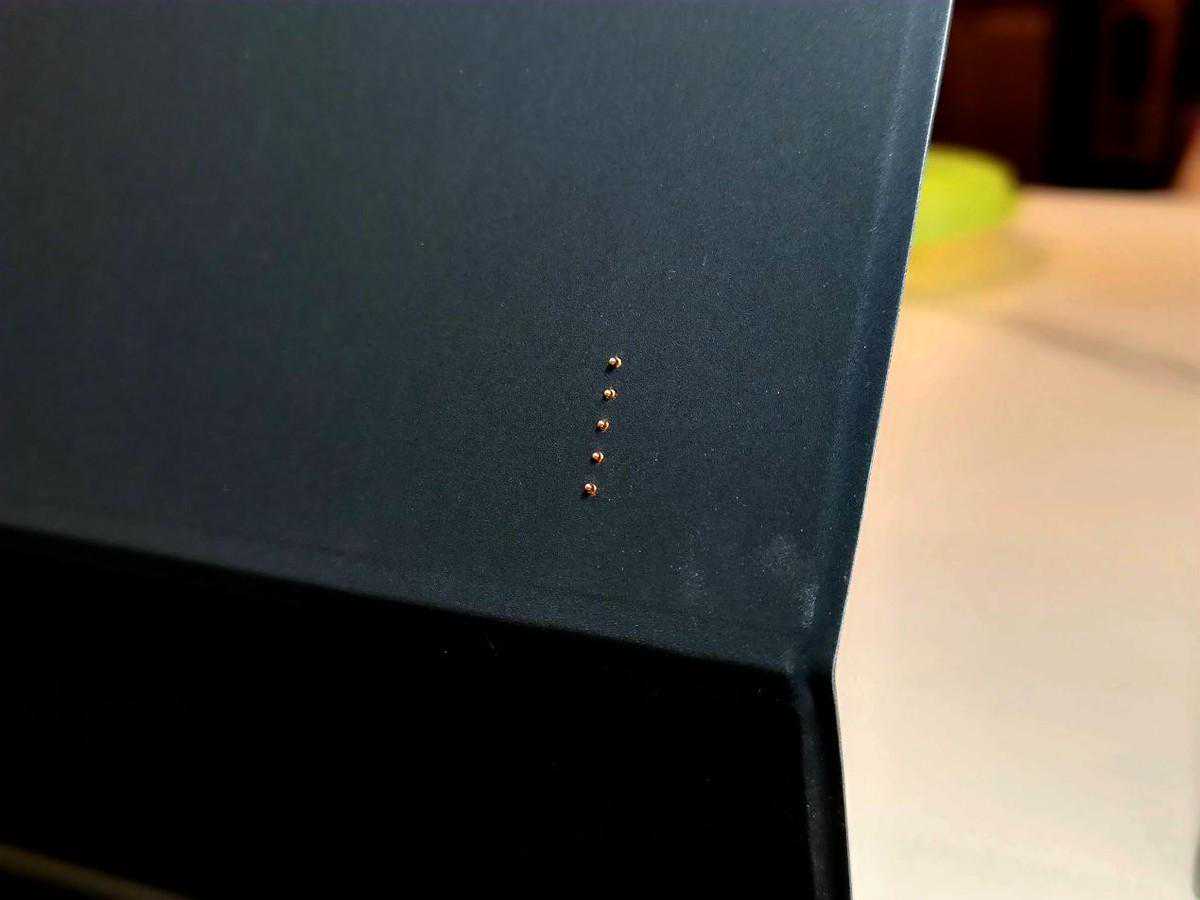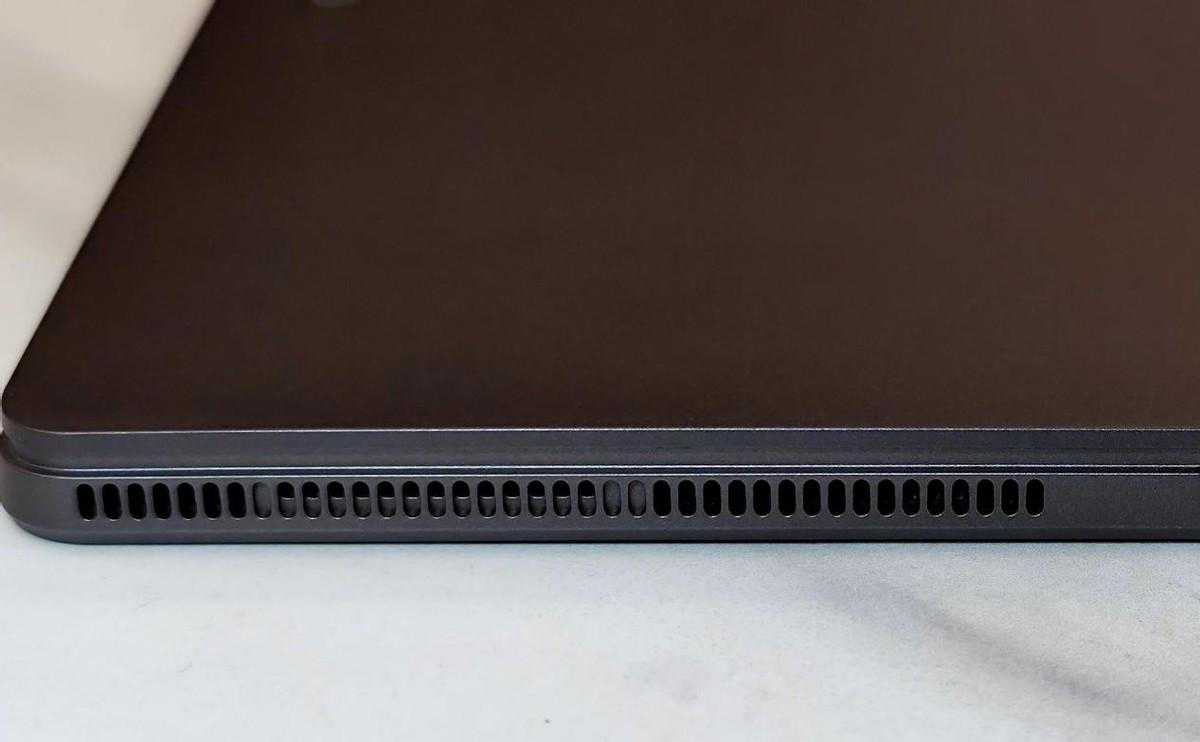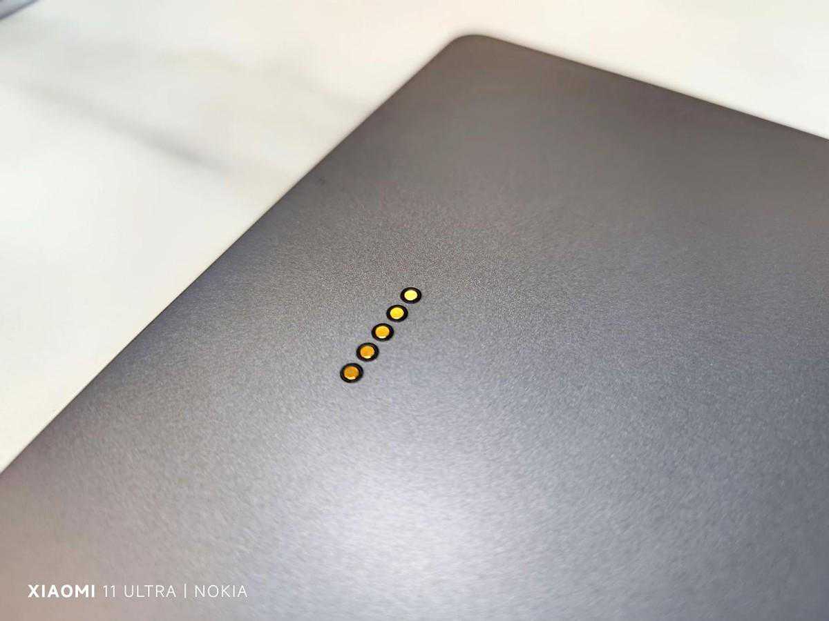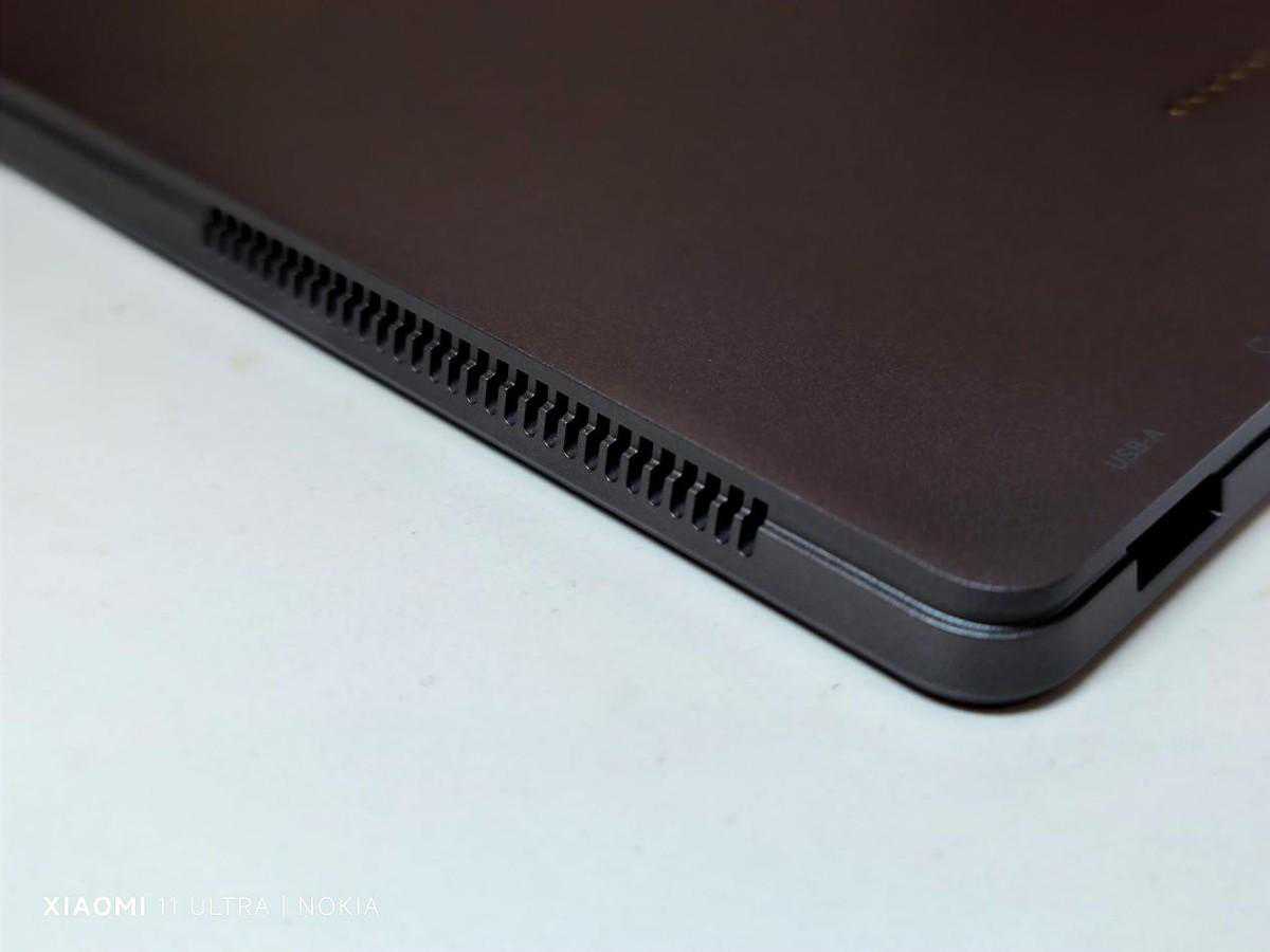 从音量键再往右走,也就是屏幕右上角的边框,是一排散热孔,这里不由得说一句,这个电脑的散热孔是真多啊,右上角边框出风口、右侧边框(下)进风口、左侧边框(下)进风口组成的散热系统,再加上内置超薄高转速大风量风扇,整机的温度控制的还是很不错的,日常使用不热。