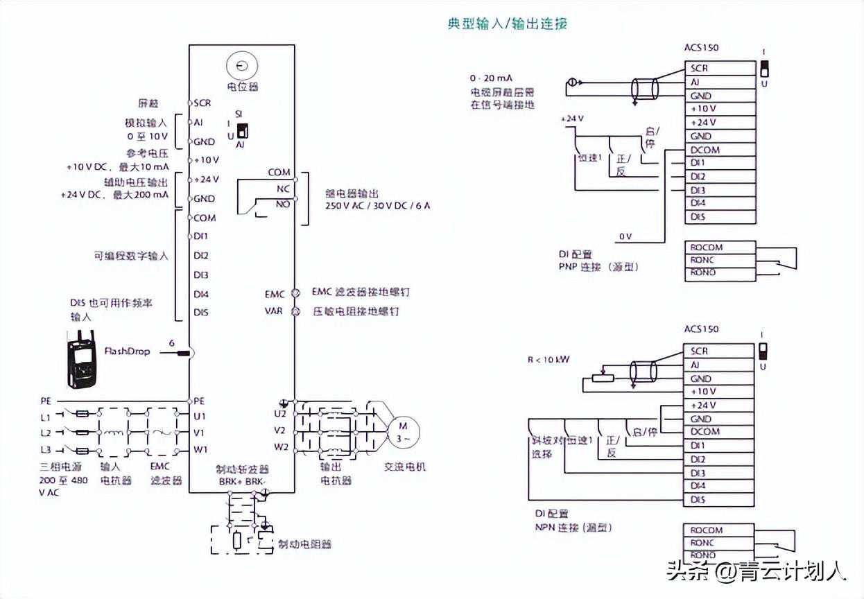 应用宏是预先编程的参数设置。当启动传动时,用户通常选择最适合应用的一种宏。下图展示了ACS150控制连接,并标出了ABB标准宏的默认I/O连接。