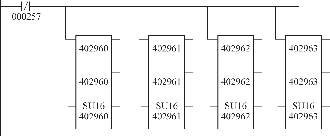 在现有控制系统中选取4个没有使用过的寄存器402960、402961、402962、402963,分别定义402960存放定位车主臂伸出时启动位置数值、402961存放定位车主臂伸出时向前行走距离数值、402962存放定位车辅臂伸出时启动位置数值、402963存放定位车辅臂伸出时向前行走距离数值。如图2所示,000257为定位车行走运行信号,当定位车停止行走时利用SU16(16进制减法)模块分别对402960、402961、402962、402963四个寄存器进行清零,为下次定位车行走时的距离计算做好准备。