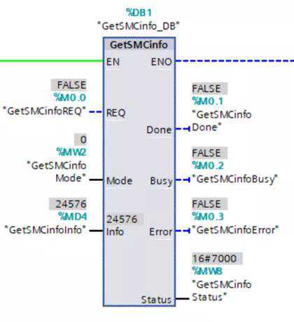 “GetSMCinfo”指令可检索当前所插入SIMATIC存储卡的相关信息,Mode=0时,读取存储卡的存储容量,如图7所示,读取到的24MB存储卡容量为24756KB。Mode为1时,读取已用的存储卡存储容量。指令调用位置如图8所示。