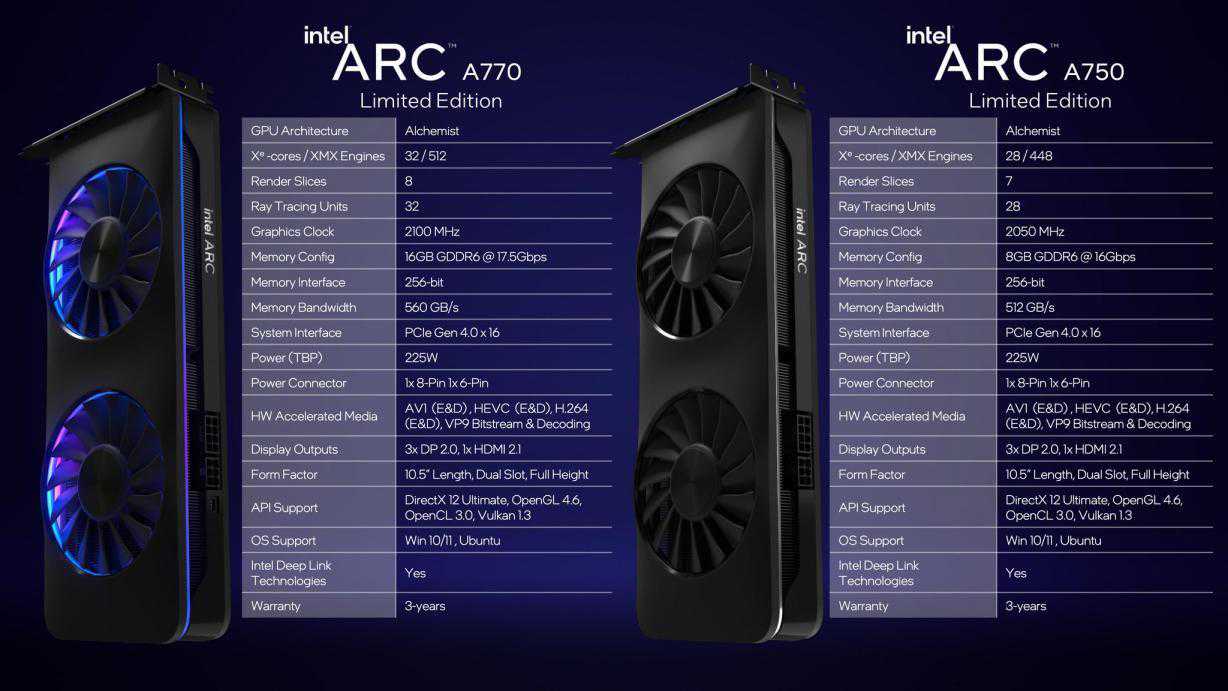 显卡基本规格如下,锐炫A750与A770默认功耗均为225W,但系统默认会限制在190W,有需要的话可以在控制面板手动拉满,但本文中我们均会在默认功耗下测试。